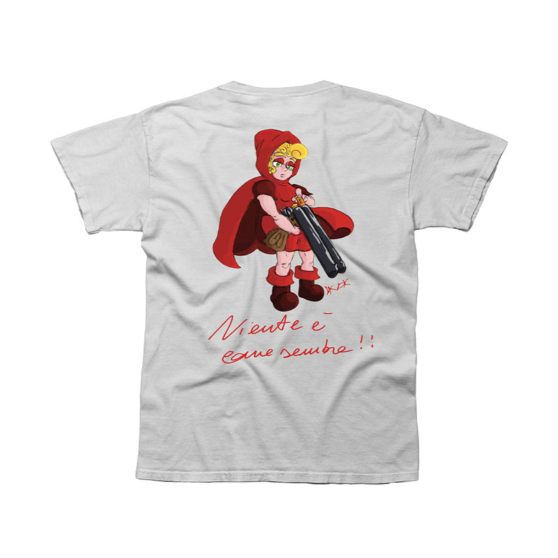 T-shirt Bianca, stampa frontale con disegno, frase "gli spari sopra sono x voi" e riproduzione dell'autografo di Vasco e sul retro l'iconica parte del brano "e se si girano gli eserciti e spariscono gli eroi // se la guerra poi adesso cominciamo a farla noi // NON SORRIDETE // gli spari sopra sono per voi" e riproduzione dell'autografo di Vasco.